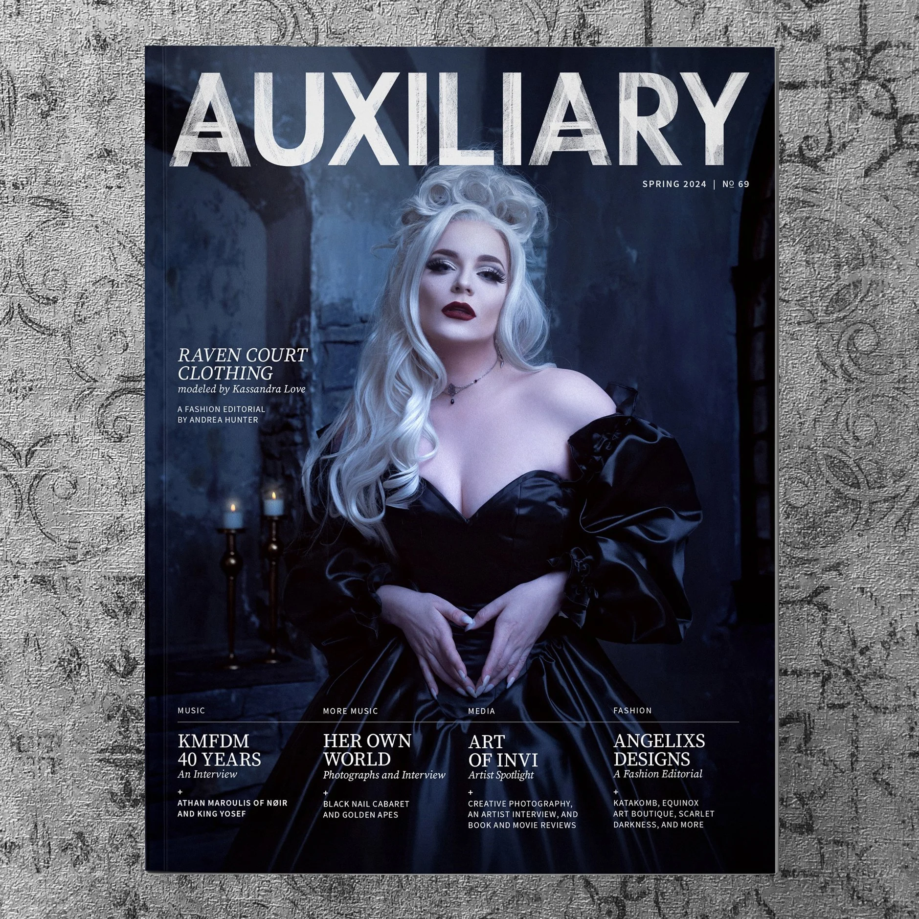 The Spring 2024 Issue is the 69th issue of Auxiliary, a magazine dedicated to subculture fashion, music, and lifestyle. This issue features Raven Court Clothing, KMFDM, King Yosef, NØIR, Black Nail Cabaret, Golden Apes, Her Own World, Art of Invi, Kassandra Love, Andrea Hunter, Katakomb, Equinox Art Boutique, Scarlet Darkness, Shana Feeley, and more. A long form delicacy full of interviews, editorials, articles, and reviews.